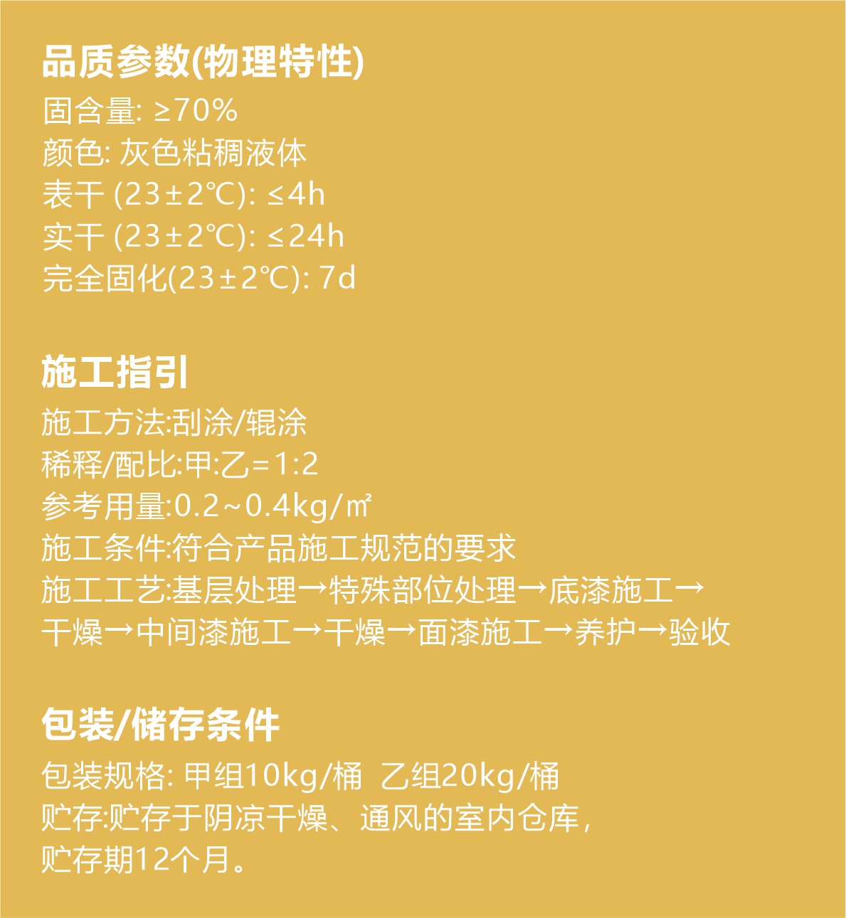 彩田重防腐高韌改性涂料是雙組份構成,甲、乙組份分裝。以天門冬氨酸樹脂為核心成膜物質,該漆干燥時間快,流平性、耐水性、耐化學品性優良,具有優良的彈性,層間附著力好。
